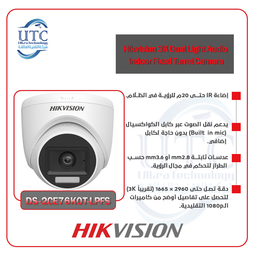 كاميرا هيكفيجن الداخلية الذكية بدقة 3K مع خاصية الصوت والإضاءة المزدوجة